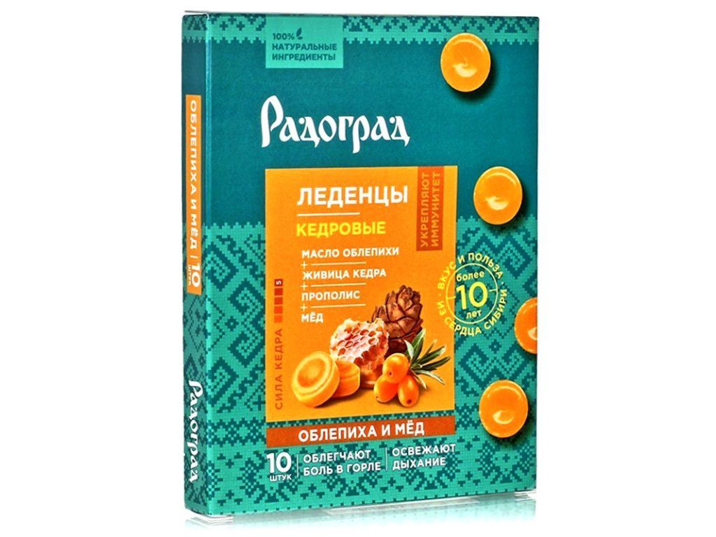 Pastilky „Radograd" s rakytníkom a medom obsahujú výlučne prírodné zložky: cédrová živica, cédrový olej, propolis, rakytníkový olej, vitamín C. Pomôžu zvládnuť prvé príznaky nachladnutia, podporia imunitný systém, odstránia bolesť a boľavé hrdlo.