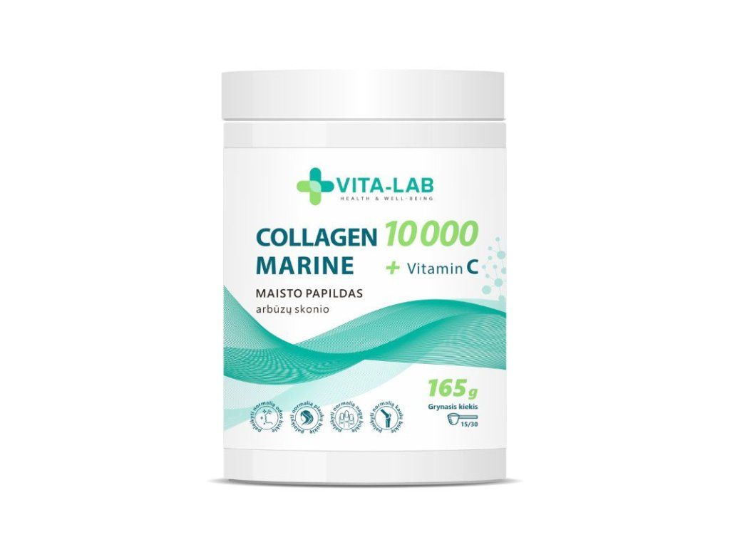 Morský kolagén 10 000 mg s vitamínom C od VITA-LAB je biologicky aktívny doplnok vo forme prášku s hmotnosťou 165 g, určený na podporu zdravia pokožky, vlasov, nechtov, kĺbov a kostí.